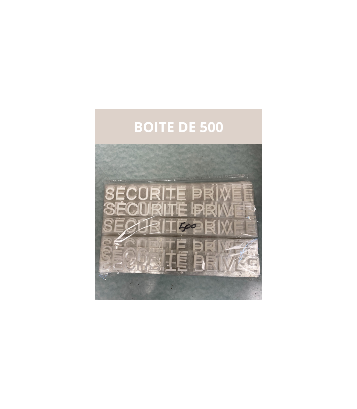Transfert thermocollant « SÉCURITÉ PRIVÉE » en blanc rétroréfléchissant, typographie Arial 76, conçu pour être apposé au dos des vêtements de travail dédiés à la sécurité privée.